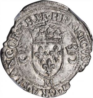 This douzain aux croissants was a billon coin issued in large numbers during the reign of Henry II (r. 1547-59). This specimen was lot 72171 in Stack's Bowers Collectors Choice Online Auction (Santa Ana, CA, May 2017), where it sold for $129.25. The catalog description[1] noted, "FRANCE. Douzain, 1551-M. Toulouse. Henry II (1547-59). NGC AU-55. Good strike and quite lustrous." These thin coins are often brittle and pieces get chipped off, which appears to have occurred in this case. Milled coinage was experimental in the sixteenth century and would not be generally adopted until the reform of 1640-42. This type had a face value of twelve deniers tournois, a denomination later occupied by the copper sou. It is the most common silver coin from this reign.