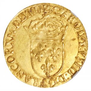This specimen was lot 70541 in Stack's Bowers Collector's Choice sale (Costa Mesa, CA, October 2021), where it sold for $504. The catalog description[1] noted, "FRANCE. Ecu d'Or, 1568-H. La Rochelle Mint. Charles IX. NGC Unc Details--Harshly Cleaned. A generally well detailed coin, with some hairlines and medium honey golden toning." This coin is called the écu d'or au soleil in Duplessy[2] with a face value of fifty sols tournois and is noted with many variations in obverse and reverse legends.