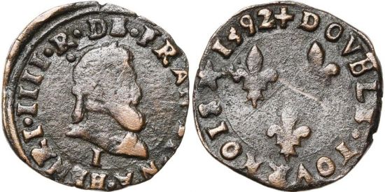 The specimen shown is a double tournois of Henry IV (r. 1589-1610) struck by the hammer at the Limoges mint (mintmark "I") in 1592. Duplessy notes that this type was the most common, struck at many mints. These coins were produced by private contractors in large quantities at a profusion of mints and in many varieties until the 1640's. The issues of Henry IV were reasonable compared to those of the regency of Louis XIII, when the queen-mother sold production contracts to many of her supporters. The face value was two deniers.