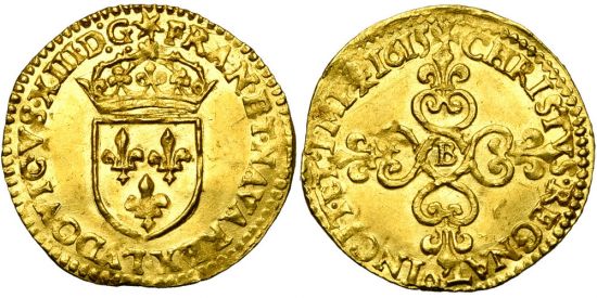 "FRANCE, Royaume, Louis XIII (1610-1643), AV écu d'or au soleil, 1615B, Rouen. 1er type. D/ Ecu de France couronné, sous un soleil. La légende débutant à 6h. R/ Croix anillée et fleurdelisée, avec B en coeur. presque Superbe. Provient de notre vente 54, 13 juin 1998, 793. (kingdom of France, Louis XIII, 1610-43, gold shield of the sunburst of 1615, Rouen mint, first type. Obverse: crowned arms of France under a sunburst, obverse legend begins at 6 o'clock; reverse: voided floriate cross with mintmark at center. about Extremely Fine.)"