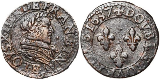 "FRANCE, Royaume, Louis XIII (1610-1643), Cu double tournois, 1637E, Tours. 7e type, spécial à Tours. D/ B. l., dr. et cuir. à d., au grand col plat. R/ Trois lis dans le champ. Rare. Très Beau. (kingdom of France, Louis XIII, 1610-43, copper double tournois of 1637, Tours mint, seventh type peculiar to Tours. Obverse: armored, laureate bust right in large flat collar; reverse: three fleurs-de-lys in the field. Rare, Very fine.)"