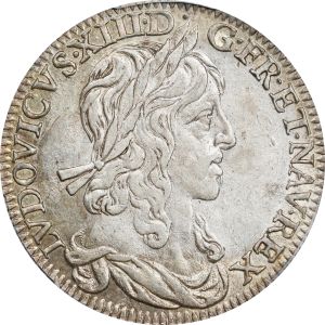 This specimen is a quart d'écu struck in Paris at the end of the reign of Louis XIII (r. 1610-43). It is a product of a major reform of French coinage which attempted to abolish hammered coinage once and for all. In this the regime was not successful, but large quantities of these handsome coins were released 1642-43 and the type is reasonably available today. All are Paris mint except for a small issue from Lyon in 1643. A variety exists where the king is only draped and not armored. The last hammered quarter écu listed is dated 1652.