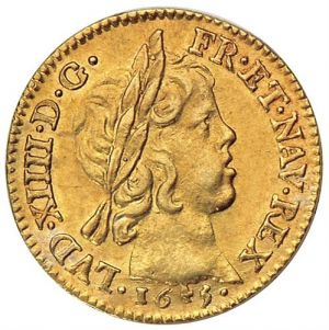 This specimen was lot 545 in Stack's "Vermuele, Ward & Mexico Maxico" sale (New York, January 2010), where it did not sell. The catalog description[1] noted, "FRANCE. Louis XIV, 1643-1715. ½ Louis d'or à la mèche courte, 1645 A. Paris. Young head r. with curl just below the ear, tiny 4 in the date. Rv. Cruciform double L's, lis in the angles, mintmark at center. Virtually as struck, a wisp of wear on laurel wreath. Choice About Uncirculated." All half louis are rare compared to their larger sisters and this type, struck 1643-45 and 1649-52, is no exception. The superseding type, the demi-louis d'or à la mèche longue, was issued 1646-61.