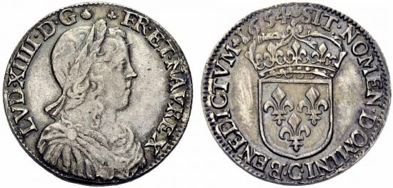 "FRANKREICH Louis XIV. 1643-1715. ½ Ecu à la meche longue 1654, Saint-Lô. Belorbeertes, drapiertes Brustbild nach rechts. Rv. Gekröntes Wappen. Min. just. Sehr schön-vorzüglich. (France, Louis XIV, 1643-1715, demi-écu à la mèche longue of 1654, Saint-Lô mint. Obverse: laureate, draped bust to right; reverse: crowned arms. Minor adjustment marks, very fine to extremely fine.)"