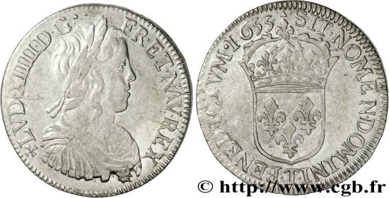 The specimen shown is a demi-écu à la mèche longue struck at Nantes during the reign of Louis XIV of France. It was lot 1288 in CGB sale 31 (Paris, June 2007). Droulers[1] prices this date about 40% more than the common 1655-A.