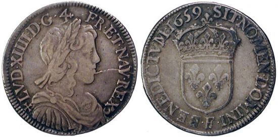The specimen shown is a demi-écu à la mèche longue struck at Angers during the reign of Louis XIV of France. It was from a recent William Rosenblum sale (Littleton, CO, February 2012), where it sold for $240. Droulers[1] prices this date about 80% more than the common 1655-A. The Angers mint closed in 1661.
