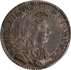 This specimen was lot 42192 in Stack's Bowers ANA sale (Oklahoma City, OK, August 2025), where it sold for $3,600. The catalog description[1] noted, "FRANCE. 1/12 Ecu, 1681-A. Paris Mint. Louis XIV. PCGS MS-62. Variety with dot under D in LVD (second semester). An EXTREMELY RARE Mint State survivor and perhaps the finest known example of the type, this lovely minor boasts wholly unimpaired surfaces and crisp detail. An exceptionally elusive opportunity for collectors of coinage of the "Sun King". From the Richard August Collection. Ex: Enterprise Collection (Heritage - 1/2004) Lot # 14624." This type was struck 1679-83 at Paris ("A") and Aix ("&"), all dates are rare.