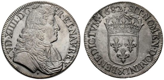 "1/2 Ecu à la cravate 1682. Aix-en-Provence Sehr schön-vorzüglich. (kingdom of France, Louis XIV, half écu of the necktie of 1682, Aix mint, very fine to extremely fine.)"