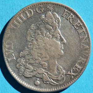 In the late 1680's the regime of Louis XIV issued a series of coins designed to circulate solely in Flanders and the other newly annexed territories on the border of the Spanish Netherlands (now Belgium). All are scarce today. This type was issued 1685-88 from the Amiens and Lille mints; a similar type was minted at Paris. It is also known as the demi-écu aux carambole.