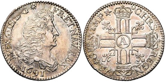 "FRANCE, Royaume, Louis XIV (1643-1715), AR quart d'écu aux huit L, 1691A, Paris. 1er type. 1e réformation. D/ B. dr. à d. R/ Croix formée de huit L couronnés, cantonnée de quatre lis. Très Beau à Superbe. Provient de notre liste 200, avril-octobre 1998, 1101. (kingdom of France, Louis XIV, 1643-1715, silver quarter écu of the eight "L's" of 1691, Paris mint, first type, first reformation. Obverse: draped bust right; reverse: cross formed of eight crowned "L's", cantonned with four lilies. Very Fine - Extremely Fine.)"