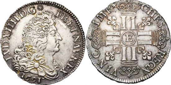 "FRANCE, Royaume, Louis XIV (1643-1715), AR demi-écu aux huit L, 1691E, Tours. 1er type. 1e réformation. D/ B. dr. à d. R/ Croix formée de huit L couronnés, cantonnée de quatre lis. Rare. Très Beau à Superbe. (kingdom of France, Louis XIV, 1643-1715, silver half écu of 8 L's of 1691, Tours mint, first type, reformed flan. Obverse: draped bust right; reverse: cross formed of eight crowned L's, cantonned with eight lilies. Rare, Very fine to extremely fine.)"