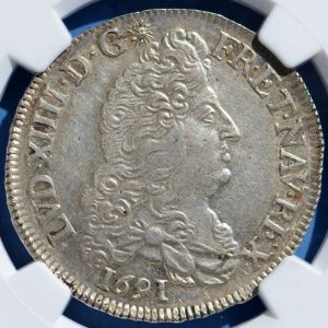 The specimen shown is an demi-écu aux 8 L ("écu with 8 L's") struck in La Rochelle during the reign of Louis XIV of France. This type was struck 1690-93 in France in large quantities, mostly overstriking older demi-écus ("flans reformés"--see the specimen shown for the visible undertype). It was succeeded by the demi-écu aux palmes. Droulers[1] prices this date as fairly common, but even a common date is priced 20% higher than a demi-écu à la mèche longue.