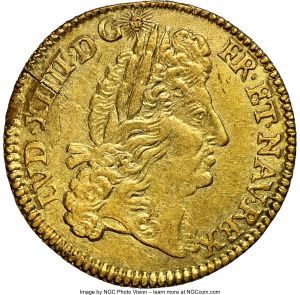 This specimen was lot 99063 in Heritage sale 61259 (Dallas, TX, February 2022), where it sold for $960. The catalog description[1] noted, "France: Louis XIV gold Louis d'Or 1691-H AU Details (Bent) NGC, La Rochelle mint. Louis d'Or a l'Ecu. Flan Reforme, star below shield. Harvest-gold patina abounds this eye-catching offering and, despite a flan crack and subsequent bend, displays an abundance of eye appeal and displays only the clearest and most well-expressed detail." This louis d'or à l'écu was struck 1690-93. This type is usually found struck over older coins, a process involving all French silver and gold coinage during 1690-1709. These "reformations" were the result of financial manipulations too tedious to discuss here. The louis d'or à l'écu was succeeded by the louis d'or aux 4 L struck 1693-1700. Both these types are the first somewhat common gold coins since the 1640's but all are expensive relative to the silver écus. Droulers[2] catalogs this date as fairly common.