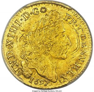 his specimen was lot 30764 in Heritage sale 3064 (Chicago, April 2018), where it sold for $1,020. The catalog description[1] noted, "Louis XIV gold Louis d'or 1697-M AU58 PCGS, Toulouse mint. An extremely unusual and previously unknown date for this mint, this lemon-gold example exhibits an abundant coverage of original luster over a comparatively boldly rendered striking. Centrally over-struck and with charmingly subtle attributes of the host coin present, this is the sole certified example by either PCGS or NGC, extremely rare, and one for the specialist collector." This type, known as a louis d'or aux 4 L, was struck in France 1693-1700, mostly over older coins.