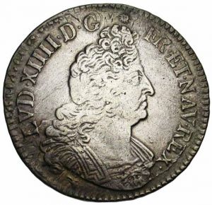 Shown is a 1702D demi-écu aux insignes of the Lyon mint in France. Note traces of an undertype; this coin usually comes struck over an earlier half écu, Droulers[1] notes that all known specimens from this mint are overstruck. The obverse dies are leftovers from the earlier buste du type au palmes. This specimen was lot 1426 in Jean Elsen sale 94 (Brussels, December 2007), where it sold for 130 euro.