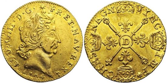 Droulers[1] calls this type louis d'or aux insignes (louis with insignia). This type is usually found struck over older coins, a process involving all French silver and gold coinage during 1690-1709. These "reformations" were the result of financial manipulations too tedious to discuss here. The louis d'or aux insignes, struck 1704-09, was preceded by the louis d'or aux 8 L struck 1700-04. Droulers[1] gives this date from the Lyon mint a 20% premium over the common date (1704-A) but none are cheap.