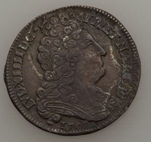 This specimen was lot 34345 in Heritage sale 3038 (Dallas, January 2015), where it sold for $646.25. The catalog description[2] noted, "Louis XIV 20 Sols 1707 (Cow) VF Scratches, Cow mintmark indicates Pau mint. A somewhat scarcer type also valued as 1/6 of an Ecu. Nicely toned with some scratches noted on the face." Shown is a twenty sols aux insignes (twenty sous with insignia) struck at the Pau mint for France in the last years of Louis XIV's reign. The type was struck 1707-08 in substantial numbers but the type is scarce today. When the coin was recalled in 1710 for melting, the government paid only 14 sols each for them. This date is rare with only two claimed to exist[1].