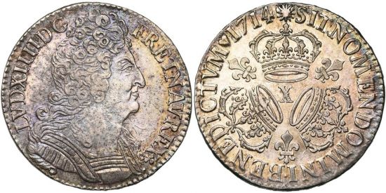 This type, called the demi-écu aux trois couronnes, was struck 1709-15 in large quantities, and is the last half écu to bear the bust of Louis XIV. It was succeeded by the demi-écu vertugadin of Louis XV. Gadoury prices this date from Amiens as slightly scarce. The SCWC has deleted this type entirely from its listings.