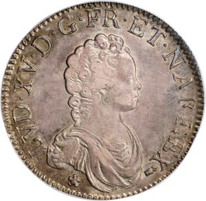This specimen was lot 74689 in Stack's Bowers Collectors Choice sale (Costa Mesa, CA, September 2025), where it sold for $408. The catalog description[1] noted, "FRANCE. Ecu, 1716-)(. Besancon Mint. Louis XV. PCGS EF-45. Flan réformé. From the Richard August Collection." This is an écu vertugadin of the Besançon mint, struck while Louis XV was a minor. Droulers[2] notes the 1716-E as scarce as "flan reformé" (struck over an earlier type) while "flans neufs" are rare. The specimen shown is a "flan reformé." The type was struck 1715-18 in substantial numbers but was replaced by the écu de France-Navarre, which is only 24.47 grams.