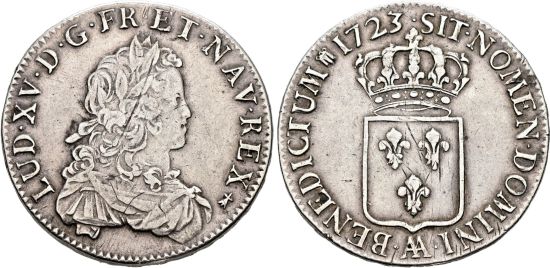 "FRANKREICH Königreich, Louis XV. 1715-1774. Ecu de France 1723 AA, Metz. Flan neuf. Sehr selten. Gutes sehr schön. Justierspuren. (kingdom of France, Louis XV, 1715-74, écu of France of 1723, Metz mint, struck on a new blank. Very rare, Good Very Fine, Adjusted.)"