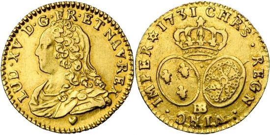 "FRANCE, Royaume, Louis XV (1715-1774), AV demi-louis d'or aux lunettes, 1731BB, Strasbourg. D/ B. drapé à g., tête nue. R/ Ecus ovales de France et de Navarre sous une couronne. Très rare. Très Beau. Provient de notre vente 65, 18 mars 2001, 1683. (kingdom of France, Louis XV, 1715-74, gold half louis of the spectacles of 1731, Strasbourg mint. Obverse: draped bust to left; reverse: oval arms of France and Navarre under a crown. Very rare, Very Fine.)"