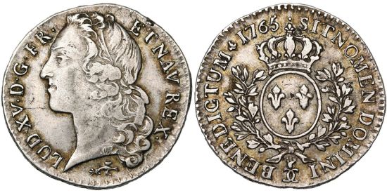 This coin, called a demi-écu au bandeau, was the French equivalent of a half dollar. In the coinage system of the ancien régime, the half écu = three livres. The type was struck 1741-74 and is recorded for the Besançon mint ("ϽC") for 1741-42, 1753, 1755-57, 1762 and 1765. This specimen is counted as a somewhat common date but most of the dates are rare.