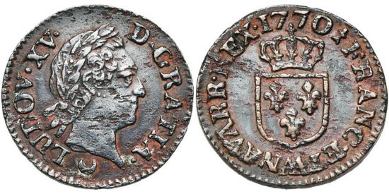 "FRANCE, Royaume, Louis XV (1715-1774), Cu liard à la vieille tête, 1770AA, Metz. D/ T. l. à d. R/ Ecu de France couronné. Défauts de flan. Très Beau à Superbe. (kingdom of France, Louis XV, 1715-74, copper liard of the old head of 1770, Metz mint. Obverse: laureate head right; reverse: crowned arms of France. Planchet defects, Very Fine - Extremely Fine.)"