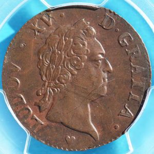 The specimen shown is a demi-sol à la vieille tête minted at Strasbourg 1770-74 at the end of the reign of Louis XV of France. Ten other mints struck this type. Its face value was 6 deniers, ½ sol or 1/240 of a silver écu. The type is common in low grade (the SCWC values it at $4 in VG) but well made specimens are scarce. The specimen shown is rather better than average.