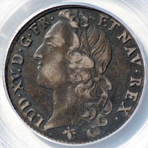 This coin, called a demi-écu au bandeau, was the French equivalent of a half dollar. In the coinage system of the ancien régime, the half écu = three livres. The type was struck 1741-74 and is recorded for the La Rochelle mint ("H") for 1741, 1744, 1747-67 and 1769-72. Most mintages were small and this date is priced about double a common date from Bayonne[1].