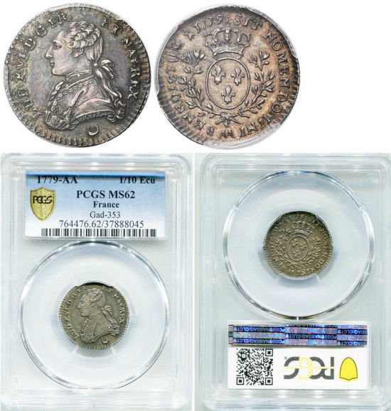 "FRANCE, Royaume, Louis XVI (1774-1793), AR dixième d'écu aux rameaux d'olivier, 1779AA, Metz. D/ B. habillé à g., les cheveux noués par un ruban. R/ Ecu de France couronné, entre deux rameaux d'olivier. Belle patine. Gradé PCGS MS62. Superbe. Provient de la collection Teitgen, Paris, 26-28 octobre 2015, 956. (kingdom of France, Louis XVI, 1774-93, silver tenth écu of the olive branches of 1779, Metz mint. Obverse: uniformed bust left, hair tied in a ribbon; reverse: crowned arms of France between olive branches. Nice patina, Extremely Fine.)"