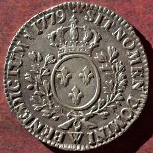 The 1779-W demi écu au buste habillé of France is among the more common dates of the type struck 1774-1792. This specimen was lot 1344 in Jean Elsen sale 109 (Brussels, June 2011) where it sold for 130 euros (about US$220 including buyer's fee). The catalog description[1] noted,