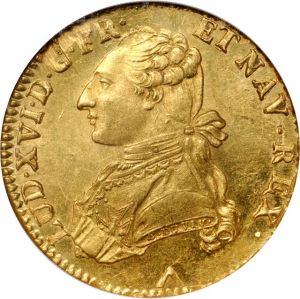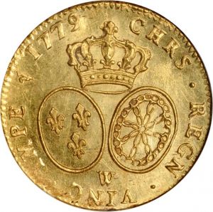 The specimen shown is a 1779-W double louis au buste habillé of the Lille mint. This specimen was lot 1301 in Stack's Coin Galleries sale (Irvine, July 2011), where it sold for $5,002.50. The catalog description[1] noted, "FRANCE. 2 Louis d’or au buste habillé, 1779-W. Louis XVI (1774-93). Young bust l. in elaborate uniform. Rv. Crowned twin shields of France and Navarre. Wealth of luster complements a vivid strike for this example of a short-lived gold coinage demonetized and largely melted in 1797. NGC MS-63." The double louis of Louis XVI continued to be struck to the standard of 1726 but the price of gold had risen, making the type uneconomical to issue. In 1785, Calonne lowered the weight to 15.30 grams and recoined all the stocks in government hands, rendering this earlier type very rare.