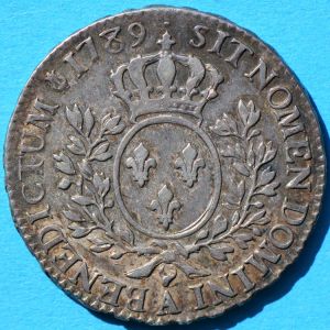 - Reverse: oval arms of France, crowned, with olive branches around, legend SIT NOMEN DOMINI BENEDICTUM 1789. Edge engraved, "DOMINE SALVUM FAC REGEM," Latin for "God save the king." The mintmark ("A" for Paris) is at the bottom, between "DOMINI" and "BENEDICTUM."