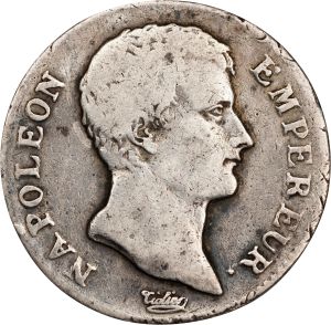 This specimen was lot 71383 in Stack's Bowers Collectors Choice sale (Costa Mesa, CA, September 2025), where it sold for $2,040. The catalog description[1] noted, "FRANCE. Empire. Franc, 1806-K. Bordeaux Mint. Napoleon I. PCGS VF-20. A VERY RARE and seldom seen type, this specimen, though heavily circulated, remains problem-free and exceptionally appealing. From the Richard Margolis Collection (acquired from Mike Geen at the ANA in Baltimore on 20 August 1985 for $50)." This issue, from the Bordeaux mint, is a rare date of a type struck 1806-07 only. A complete set of this type comprises 19 date and mintmark combinations, all rare except the 1806-A and 1806-L. In 1806 the French revolutionary calendar was dropped and normal AD dating resumed.