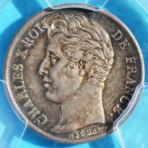This dime-sized coin was struck at Paris under the régime of king Charles X of France (1824-30). It is a common date of a type struck 1825-30. It was demonetized in 1869. The catalog[1] notes 54 dates for the type, some very rare.