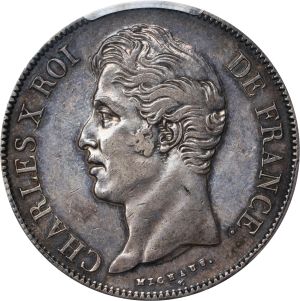 This specimen was lot 74840 in Stack's Bowers Collectors Choice sale (Costa Mesa, CA, September 2025), where it sold for $105. The catalog description[1] noted, "FRANCE. Kingdom. 5 Francs, 1829-BB. Strasbourg Mint. Charles X. PCGS Genuine--Cleaned, AU Details." This type was struck during the reign of Charles X (1824-30) from numerous mints. The silver five francs of this regime are divided into two types, most easily distinguished by the position of MICHAUD's name near the base of the king's bust. The specimen shown is the second type and is a slightly better date from the La Rochelle mint. Many the 52 dates of this type are known from a handful (<10) of examples. The type is not difficult to find but is expensive in high grade.