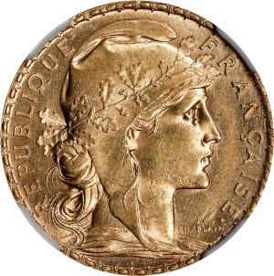 This specimen was lot 73137 in Stack's Bowers Collector's Choice sale (Costa Mesa, CA, February 2023), where it sold for $360. The catalog description[1] noted, "FRANCE. 20 Francs, 1902. Paris Mint. NGC AU-58. Nearly fully lustrous and displaying only the lightest touches of wear, this bright and wholesome piece is certain to command much attention." This type was struck in Paris 1899-1906; later issues had the edge lettered LIBERTE + EGALITE + FRATERNITE. American coin dealers refer to these coins as "roosters." This type does not bear a mintmark.