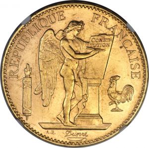 This specimen was lot 29757 in Heritage sale 3040 (Chicago, April 2015), where it sold for $1,762.50. The catalog description[1] noted, "Republic gold 100 Francs 1903-A MS62 NGC, Paris mint, Choice for the grade with much fewer visible marks than are typically acceptable at the grade designation. From The Baron Collection." This type was struck 1878-1906. In 1907, the edge lettering was changed to read LIBERTE EGALITE FRATERNITE. The mintage of all gold coinage was suspended in 1914. Of the three types of large gold 100 francs, 346,000 were struck of Napoleon III "bare head," 97,000 were struck of Napoleon III "laureate head," and 274,000 were struck of the "génie." Most survivors are bagmarked AU.