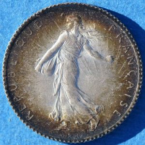 Specification: 5 g, 0.835 fine silver, 23 mm diameter, reeded edge. It was designed by Oscar Roty, 1846-1911. La Semeuse, or Sower, was so popular that the design was revived for the franc of the Fifth Republic, struck in nickel 1959-2001.