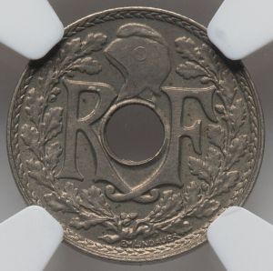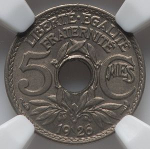 The first specimen was part of lot 22415 in Heritage sale 61352 (Dallas, December 2023), where it sold for $65. The catalog description[1] noted, "France: Republic 3-Piece Lot of Certified Assorted Issues NGC, 1) Republic 20 Francs 1934-(sl) MS63 NGC, Paris mint, KM 879; 2) Republic 25 Centimes 1926 MS66 NGC, Paris mint, KM 867a; 3) Republic 5 Centimes 1926 MS64 NGC, Paris mint." This specimen is a common date of a series struck 1920-38 during the waning years of the Third Republic. It superseded a similar but slightly larger coin struck 1917-20. This design was also used for similar ten and twenty-five centimes pieces; the central hole kept it from being confused with larger denominations with similar diameters. This coin is very common in circulated condition but hard to find choice.