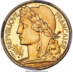 "France: Republic gold Essai 100 Francs 1929 MS65 NGC, Paris mint. By André Lavrillier. An exceedingly rare Essai of which the Standard Catalog reports that a mere 15 examples were struck, of which this is currently tied for the joint finest at NGC. Showcasing a definitive Specimen-quality strike with Prooflike reflectivity and lightly frosted devices, despite its standard business-strike assigned grade, we feel that this coin is deserving of a special designation. One of fewer than 5 we have had the privilege to present, with the last example--an MS63--bringing $8400 in our January 2018 sale #3061. Ex. Heritage Auction #3004 (January 2009, Lot 21059)."