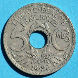 This specimen is the final date of a series struck 1920-38 during the waning years of the French Third Republic. It was superseded by a similar coin struck in copper-nickel-zinc 1938-39. The addition of zinc made the coin cheaper to strike. Dots were added next to the date to mark the change. This design was also used for similar twenty-five and ten centime pieces; the central hole kept it from being confused with higher denominations with similar diameters. This coin is very common in circulated condition but hard to find choice.