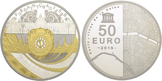 "EDELMETALL-AUKTION | FRANCE | Kingdom, 5. Republik, seit 1959. 50 Euro 2016. Monnaie de Paris. UNESCO. Banks of the Seine. Feingewicht total: 147.42 Gramm. Exemplar 31/500. Polierte Platte. FDC. In Originalschachtel mit Zertifikat. (fifth republic of France, fifty euro of 2016, Paris mint, the banks of the Seine, a UNESCO Heritage site. Uncirculated, In original box with certificate.)"