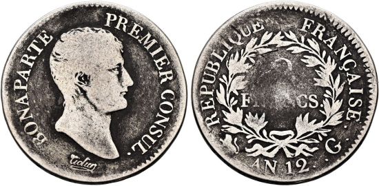 Of the silver denominations of the franc Germinal, the two francs is consistently the scarcest and when found, likely to be in poor condition. This type was struck year 12 only and Paris ("A") and Limoges ("I") are the most common mints.