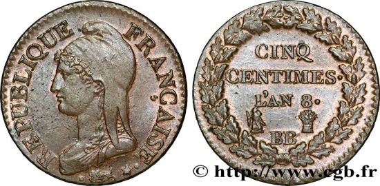 During An 8, this type was struck at Paris ("A"), Metz ("AA"), Strasbourg ("BB", shown here), Lyon ("D"), Geneva ("G"), Limoges ("I"), Bordeaux ("K") and Lille ("W"). Paris, Metz, Strasbourg and Lille are common. The catalog[2] notes a regular date and several overdates, as well as an overmintmark, BB/T, and a "CNIQ" error. The specimen shown is noted as An 8/5 with the BB/T repunched mintmark and with the wheat sheaf privy mark punched over an anchor.