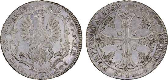This specimen was lot 2923 in Steve Album Auction 51 (Santa Rosa, CA, January 2025), where it sold for $228. The catalog description[1] noted, "FRANKFURT AM MAIN: Free City, AR 1/2 thaler, 1762, once lightly cleaned, VF-XF, ex Joe Sedillot Collection." While Frankfurter coinage was intermittent in the eighteenth century, the year 1762 saw the issue of ten kreuzer, twenty kreuzer, thirty kreuzer, half thaler (shown here), thaler and ducat. This type was struck again in 1764.