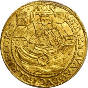 "Unpublished and Apparently Unique Double Rose Noble, Pedigreed to 1848. NETHERLANDS. Gelderland. Double Rose Noble, ND (1583-84). PCGS MS-63 Gold Shield. Obverse: MONETA NOVA AV DVC GELRIE COM Z, regal figure, holding shield and sword, standing facing in ship bearing rose; banner to left; Reverse: + DEVS TRANSFERT ET CONSTITVIT REGNA, central rose in sunburst; all within polylobe with alternating lis and crowned lions rampant. An incredibly majestic and awe-inspiring RARITY, this unique piece, struck twice the weight of the single rose noble, can be traced all the way back to the Westhoff Collection from 1848. Featuring a great strike that is perfectly centered on a flan of good metal, this singular specimen may, in fact, have been intended to be a proposed type or example of the fine work that could be produced so soon after Gelderland broke from the Spanish Netherlands and joined the protestant Union of Utrecht. We expect that this impressive piece will generate a great deal of enthusiasm and spirited bidding from an eager community. Ex: Stack's (1/2008) Lot # 3077. Ex: Golden Sale of the Century, Part II (Kreisberg/Schulman - 1/1963) Lot # 3266. Ex: Rijnbende Collection (1890) Lot # 16. Ex: H. Westhoff, Jr. Collection (1848) Lot # 4549."