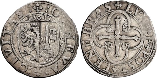 "SCHWEIZ Genf/Genève, Stadt und Kanton, 3 Sols 1561, Genf. Mzz. P. Selten. Sehr schön. (Switzerland, city and canton of Geneva, three sols of 1561, Geneva mint. Rare, Very Fine.)"
