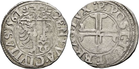 "SCHWEIZ Genf/Genève, Stadt und Kanton, 1 Sol 1561, Genf. Mzz. P. Sehr schön. (Switzerland, canton of Geneva, one sol of 1561, Geneva mint, mintmark "P". Very fine.)"