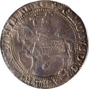 This specimen was lot 40309 in Stack's Bowers NYINC sale (New York, January 2019), where it sold for $2,400. The catalog description[1] noted, "GREAT BRITAIN. Crown, ND. Charles I (1625-49). PCGS VF-35 Gold Shield. Obverse: King on horseback left, inner circle within legend; Reverse: Shield over long cross, with cross tips extending through legend. Toned in even dark gray shades throughout with pleasing detail remaining in the centers as well as around the legends." Spink[2] lists S-2753 thru S-2762 for the major varieties of this silver crown struck at the Tower mint. After the Civil War erupted, these were also struck at Shrewsbury (S-2925 and S-2926), Oxford (S-2946 thru S-2949), Truro (S-3045) and Exeter (S-3055 thru S-3062). This example is not dated but can be identified as 1625 from the fleur-de-lys mintmark.